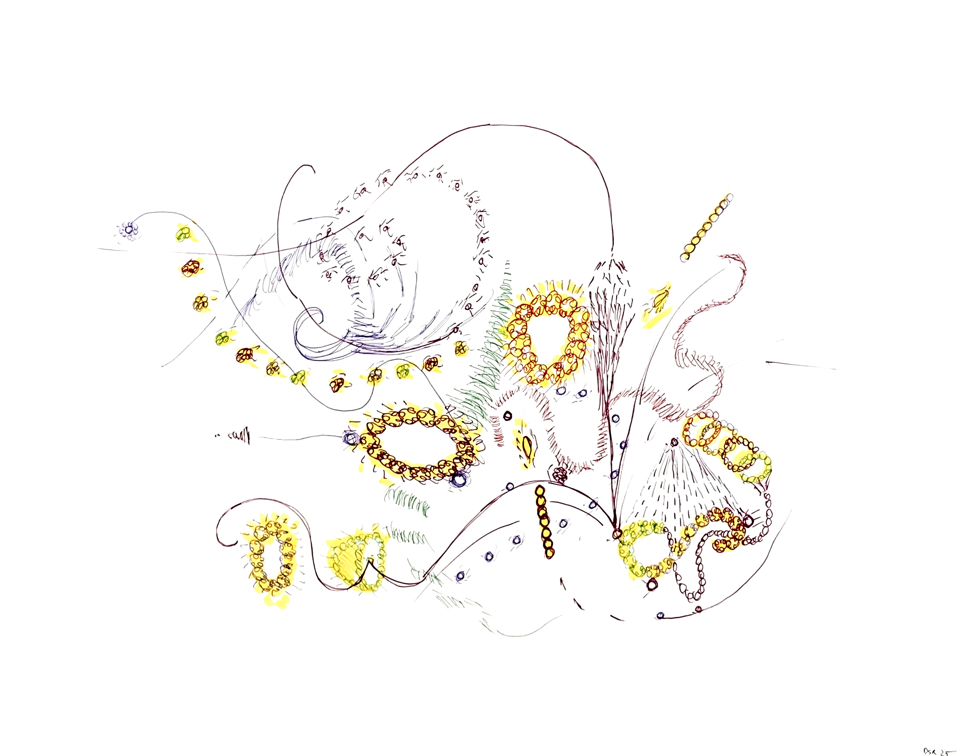 David S. Rubin practices automatic drawing—drawing spontaneously with no specific composition in mind—on a daily basis. As a graduate student in the 1970s he conducted extensive research into the relationship between Surrealist automatism and the origins of Abstract Expressionism. At that time he interviewed the Surrealist Gordon Onslow Ford, who limited his formal vocabulary to only lines, circles, and dots because he felt they were the fastest forms an artist can make and, thus, the most truly “automatic.” Rubin’s new automatic drawings, which use primarily lines and circles, incorporate a visual language of personal spiritual symbols: cellular forms that he calls “pearls of wisdom,” candles, which represent blessings or prayers, DNA chains that signify continuity of humanity through the ages, and hybrids of chains and halos. Rubin, who favors a playful, uplifting aesthetic, calls the current series “Hope” because the symbols all signify aspects of hopefulness, something the artist believes can help us through these difficult times.